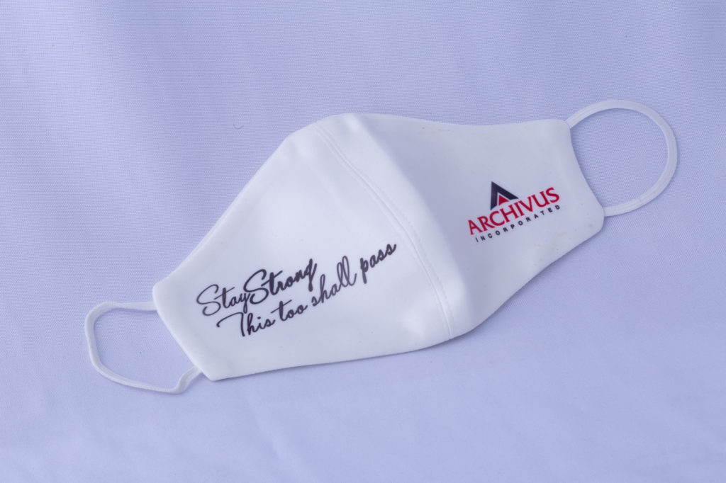 White neoprene face mask with pocket for additional filter and 2 small prints